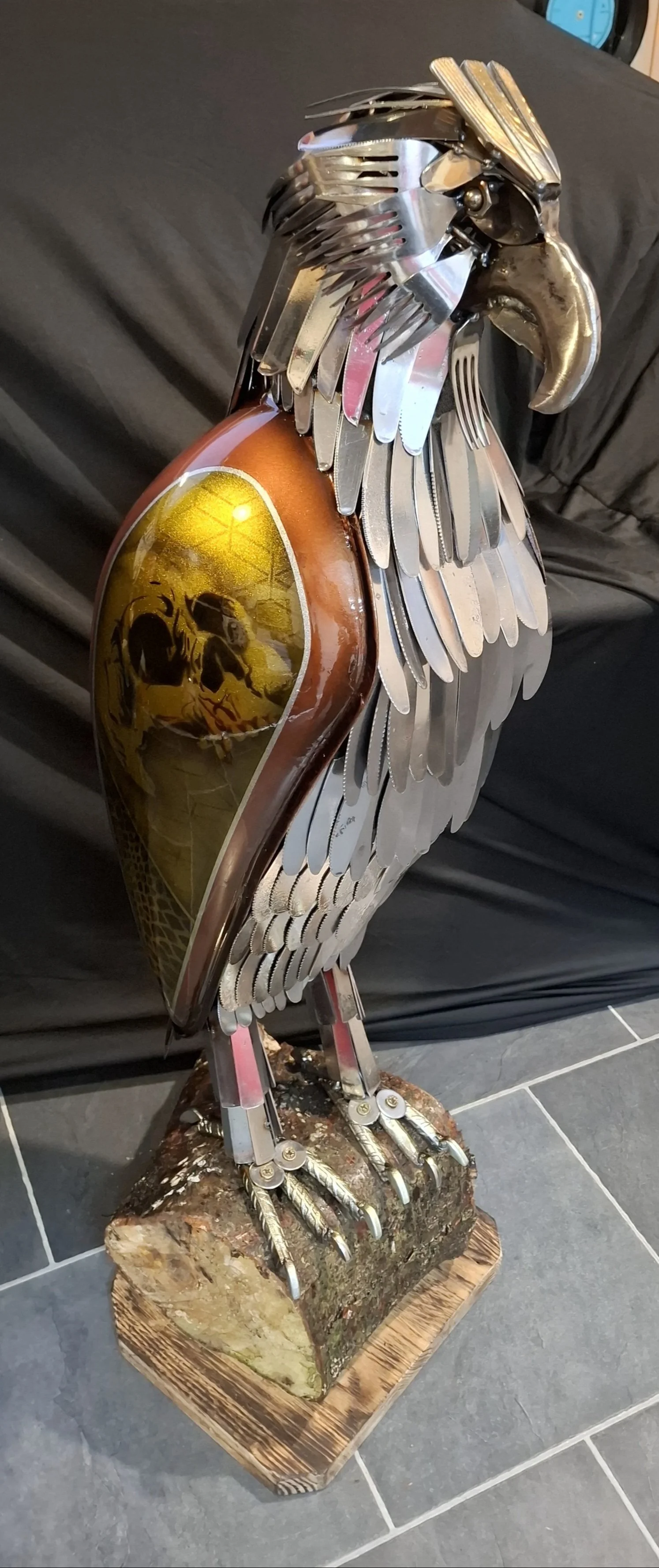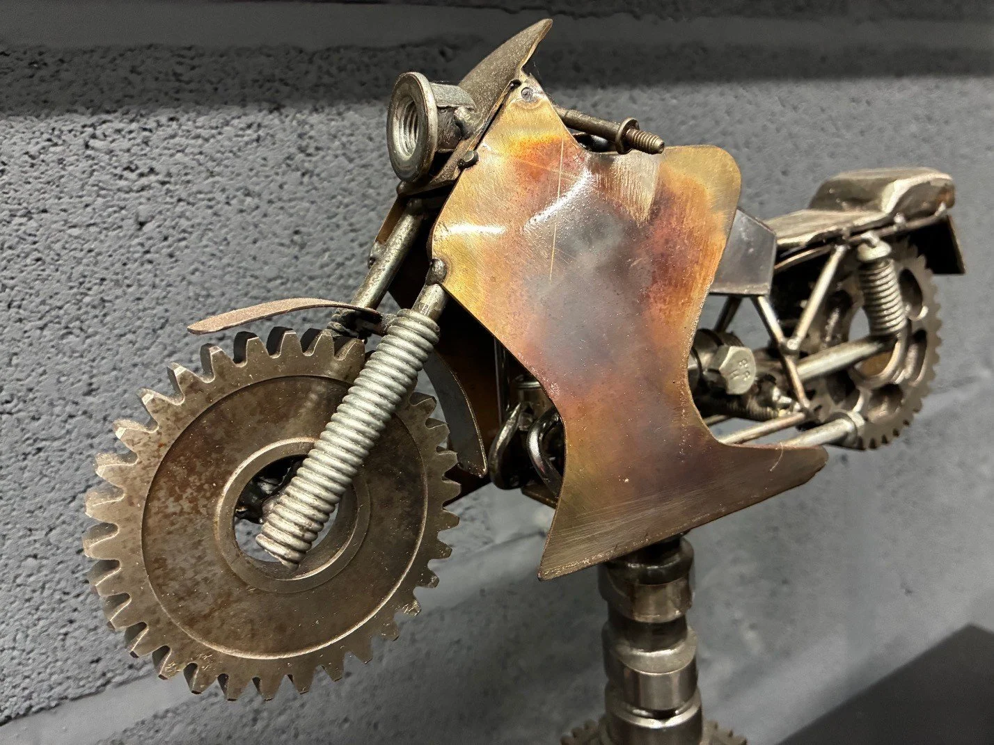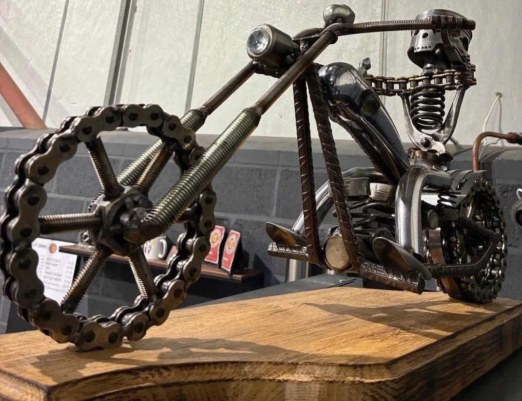 Dave’s work really does have to be seen to be believed as the details that come to light when you look closely are what sets them apart. Where I see an old fork, a scrap piston or a seized bearing bound for the metal skip, Dave sees a radiator grill for a hotrod, a rib cage or a skull.